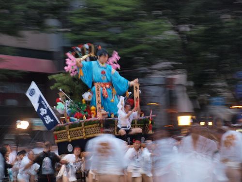 今年の西流は、皆さんご存知、その勇気と清々しさを持つ牛若丸をテーマにした舁き山。 街を疾走する姿は表(前方)が上がっており、走りが絶好調な様子。