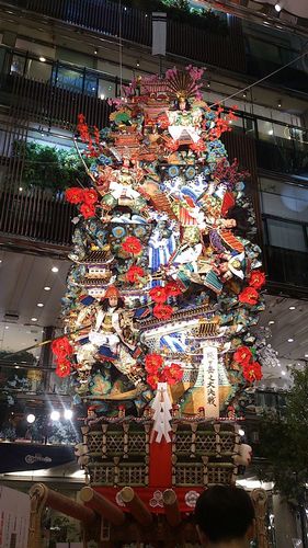 【飾り山:上川端通+櫛田神社】 今日の福岡も天気がすぐれません。 明け方には結構な雨が降りました。 山笠関係行事では、今日は「集団山見せ」。 博多(那珂川の東側)エリアでの行事が基本の舁き山が、唯一、那珂川を渡って福岡エリア(天神地区)に舁き山を披露する行事です。 今日は、飾り山をご紹介する最終回。 最後に残った不動の八番山笠・上川端通と、番外の櫛田神社常設の飾り山をご紹介します。