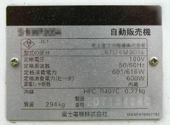 飲料の自動販売機は冷却・加熱を要するので,消費電力も 600W 程度とオーブントースター並です。 同じ自動販売機でもタバコなど冷却・加熱を要しないモノの場合,消費電力は冷蔵庫よりやや少ない 100W くらいです。 それでは,日本の自動販売機がどの程度の電気を喰ってるのか? まずは飲料の自動販売機の消費電力を,1台当たり 500W (= 0.5kW) として試算すると, 276万2400台 × 0.5kW = 138万1200kW … (a)