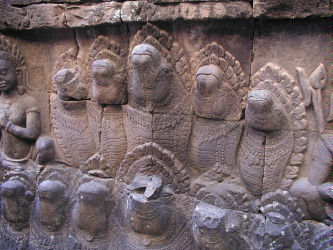 王宮敷地内には,石造りのピミアナカス寺院が残るのみですが,かつては木造の王宮がありました。 アンコールの遺跡群では気候の関係もあるのか,現在では木造の建築物は殆ど残っていません。 王宮を左に見ながら北に進むと,ライ王のテラスがあります。 このミステリアスなライ王の本物は,プノンペン国立博物館に保存してありますので,興味ある方は足を運んでみて下さい。 | ||||||||||||||||||||||||||||||||