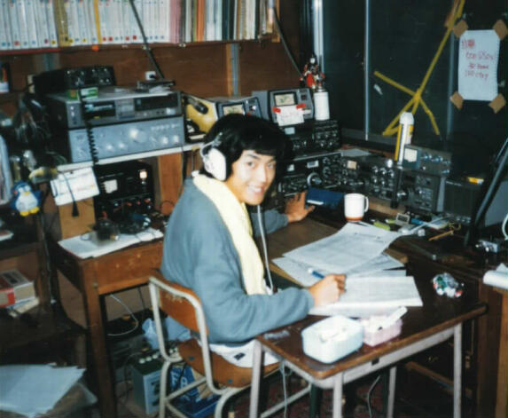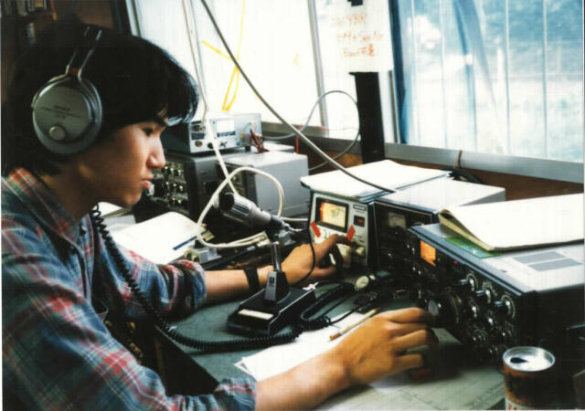 CQ ham radio の表紙か? 「アマチュア無線の見本」みたいな写真。 こりゃ 出来過ぎだね>梅ちゃん! 1986年 All Asian Phone コンテストで 28MHz を 丹念にワッチする JH5GLL。 リグの TS-830 は,1983年頃に当時の部員で資金 を出し合って購入したもので,その後,大活躍した。