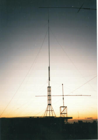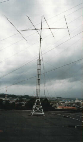 YBR で最も得意とする 21MHz と 28MHz のデュアルバンド 4el の 218A(左)と, 85年CQ WW CW 以来,霧島町のキャンパスで最後まで活躍した 7MHz 用の CV-48 with 20-radials。 このコンテストでは,朝 7MHz で LU(アルゼンチン)から呼 ばれ「ダントツの強さだ,アンテナ何を使っているのか?」とビックリされた。