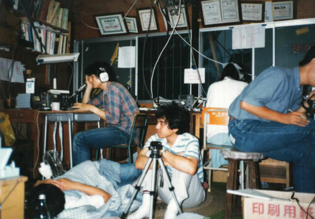 頑張ってワッチ・オペレートしているのは,JH5GLL(左), JG6OFE(中) そして当時 航空大学校学生の助っ人 JP1LRT(右)。 休養を取って寝ているのは JG6CVO。 この写真の「主演」は,状況をモノともせずに,熱心に部室のTV(「スケバン 警部」かなぁ?)を見ている JG6QZE である。(流石である。)