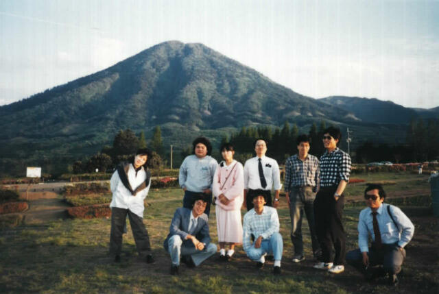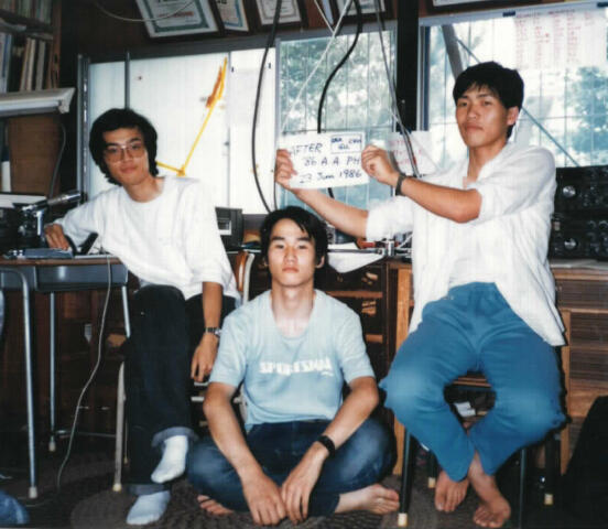 霧島町の旧キャンパス最後の '86年 All Asian Phone コンテストが終わった。 みんなそれぞれに力を出し合っての最後のコンテストだった。 結果はマルチ Op,オールバンドで 775qso-102ctry の 76,704点。 6月23日の月曜,朝9時 のコンテスト終了直後に撮影したもので,左から JF6DEA, JH5GLL と JG6CVO。